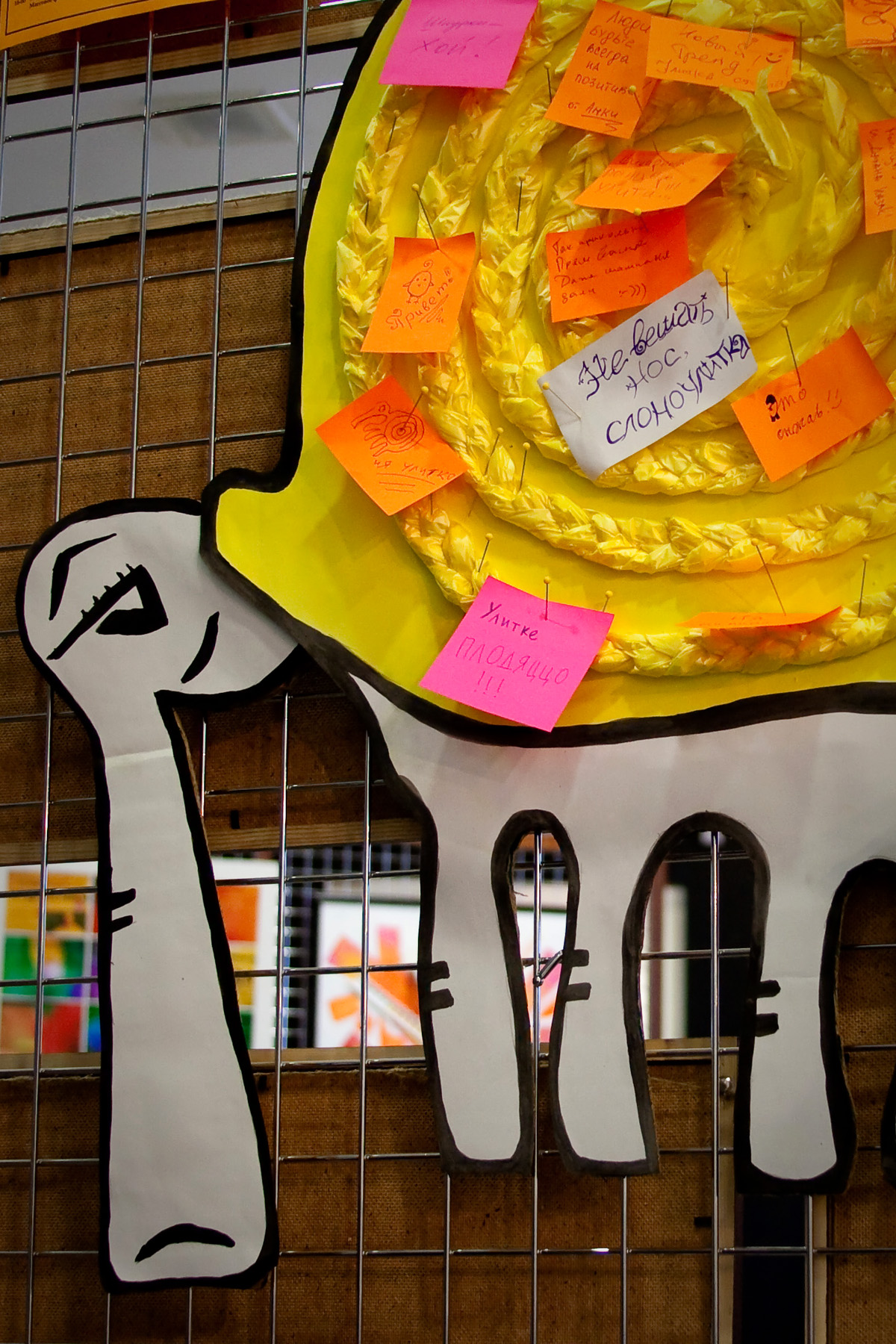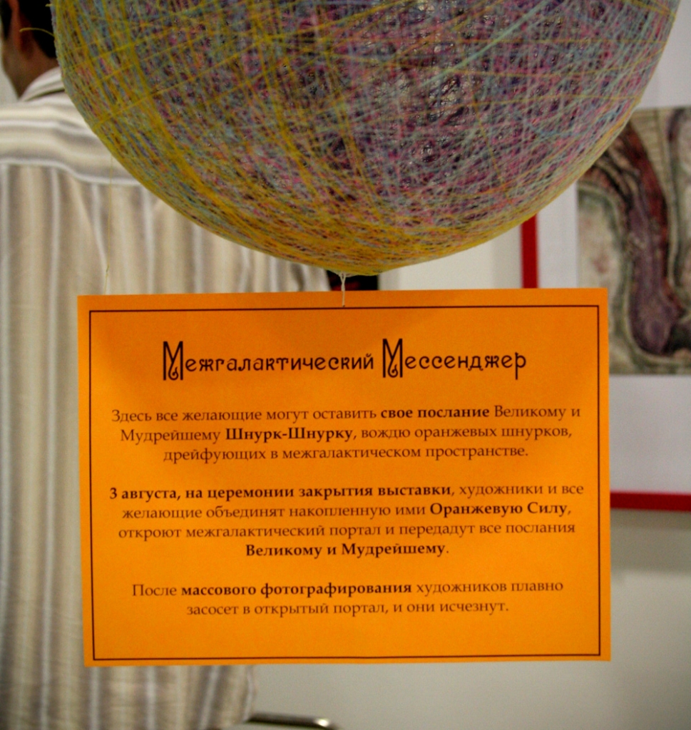 Помимо девушки с зонтиком сообщения и пожелания принимали желтая "слоноулитка" и межгалактический мессенджер, подвешенный к потолку и призванный передать наши мысли вождю оранжевых шнурков. Не факт, что он ответит, но сама возможность писать записки шнуркам и сдвигать сознание немного в сторону от повседневности очень радует.