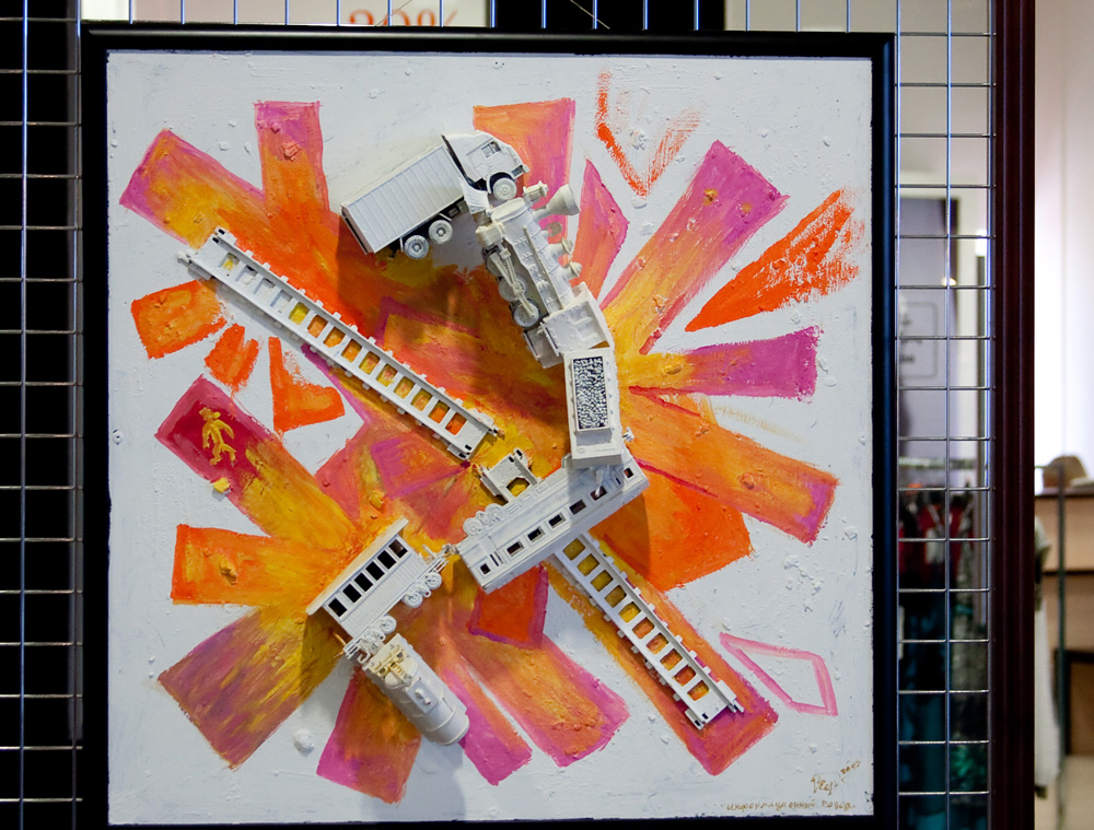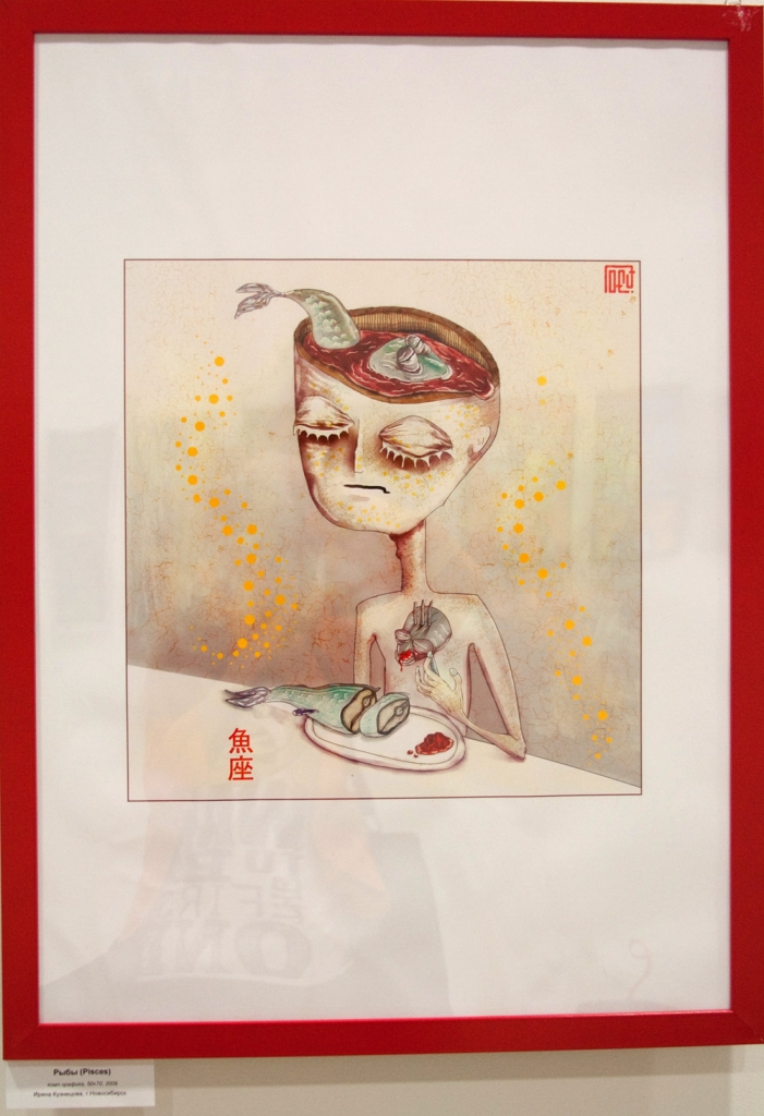 На выставке и правда было достаточно как черного и мрачного, так и радостного (в первую очередь, оранжевого) настроения. Сплошные безумия и парадоксы. Рядом с жутковатыми, болезненными картинами со старостью, головной болью и прочими ужасами стояла их автор Ирина Кузнецова – в яркой одежде, с веселой улыбкой, разрисованным лицом и оранжевым шнурком на запястье. Вообще картинам не обязательно быть светлыми или депрессивными, серьезными или смешными. По словам Ирины, для выставки выбирали только "сдвинутые" работы – во всех смыслах этого слова.